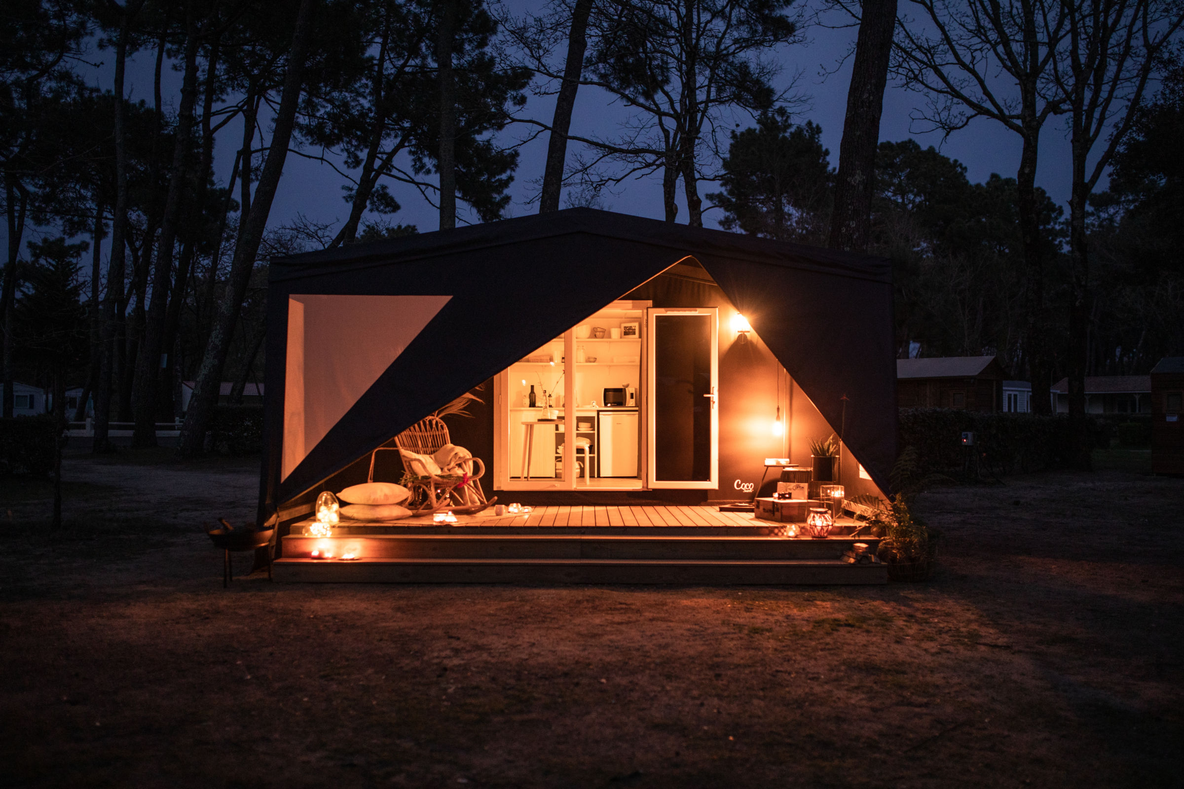 « COCO c’est un mobil-home à la forme ronde recouvert d’une toile. Ses murs sont rigides et isolés, sa porte d’entrée ferme à clef. Il peut recevoir 4 personnes avec ses 2 chambres équipées de sommiers avec matelas. Il n’offre pas de sanitaire mais une kitchenette équipée d’un four micro-ondes et d’un frigo »